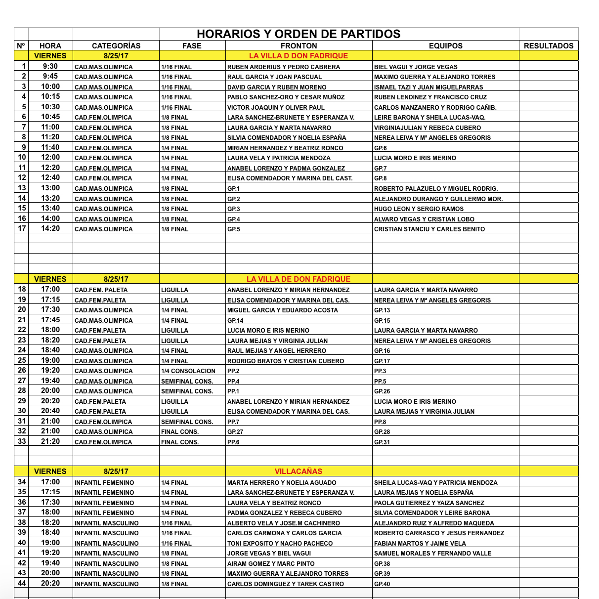 Clasificación Cadete Masculino Pala