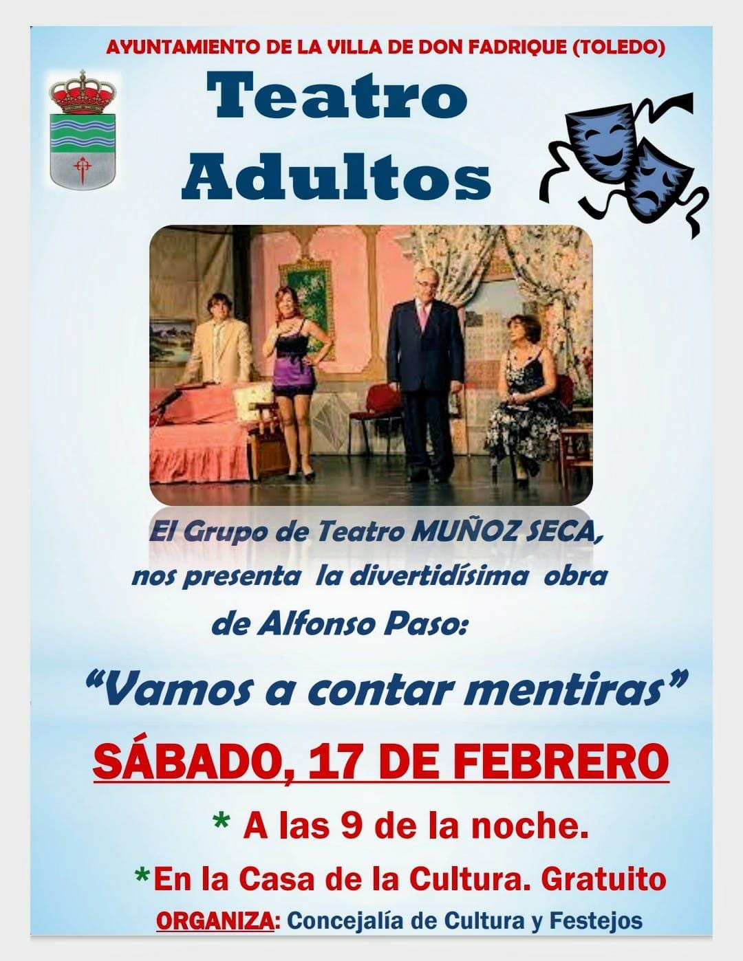 La obra de Alfonso Paso, "Vamos a contar mentiras" que pondrá en escena la Compañía de teatro de "Muñoz Seca". Entrada gratuita.