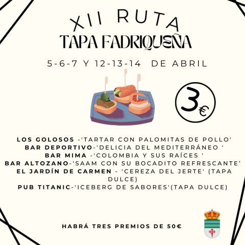 La Villa de don Fadrique celebrará, del 5 al 7 de abril, y del 12 al 14 de abril, es decir, los dos primeros fines de semana del mes, la XII Ruta de la Tapa Fadriqueña, una iniciativa organizada por el Ayuntamiento de la localidad para promocionar el turismo y el comercio a través de la Concejalía de Cultura y Festejos, junto a los establecimientos participantes.