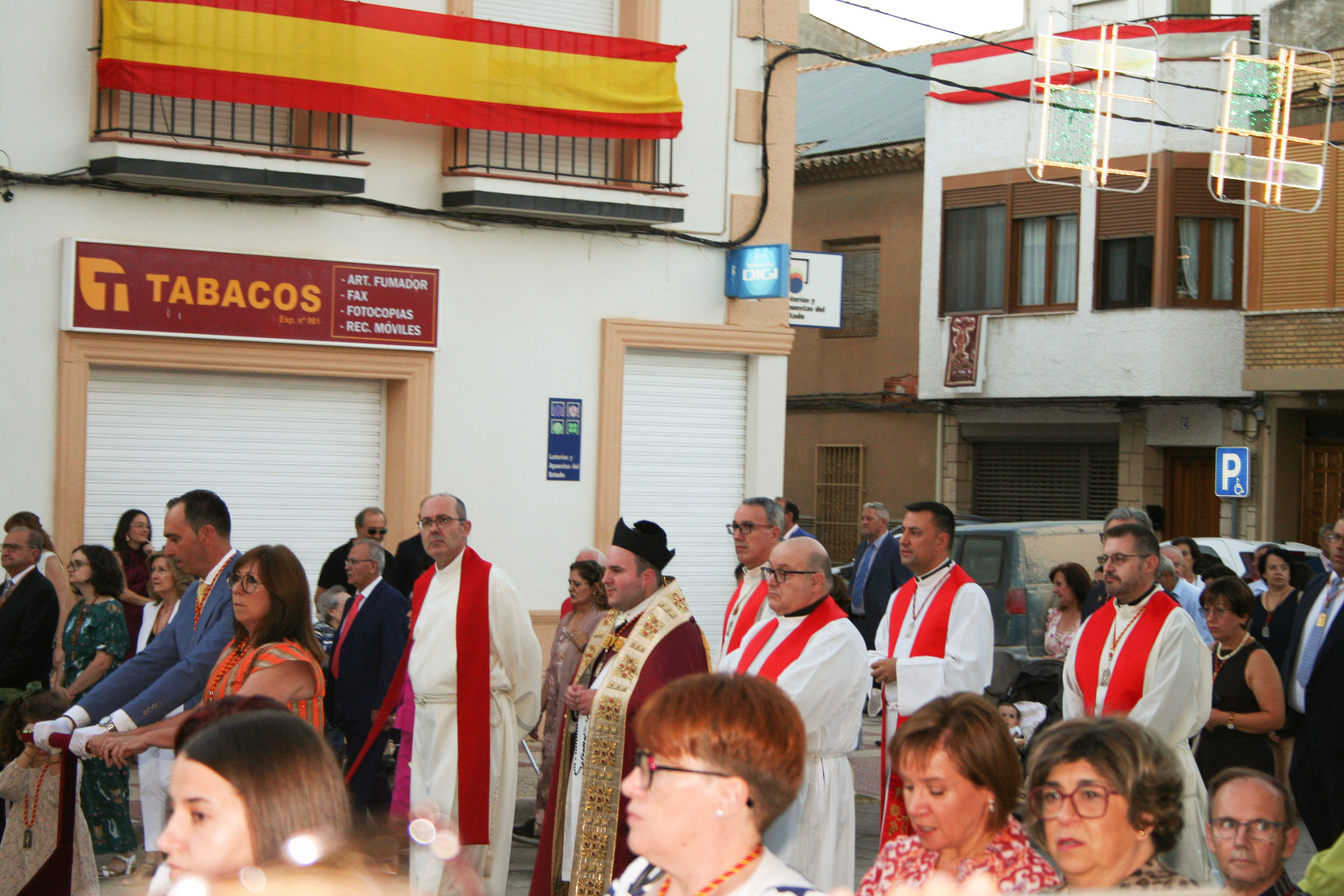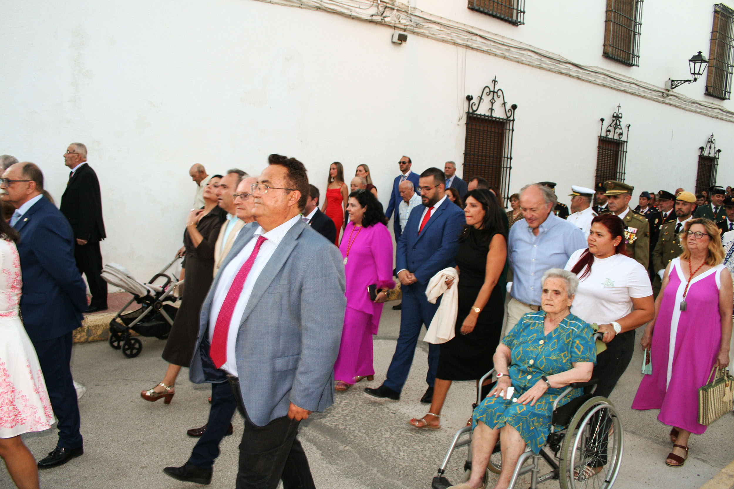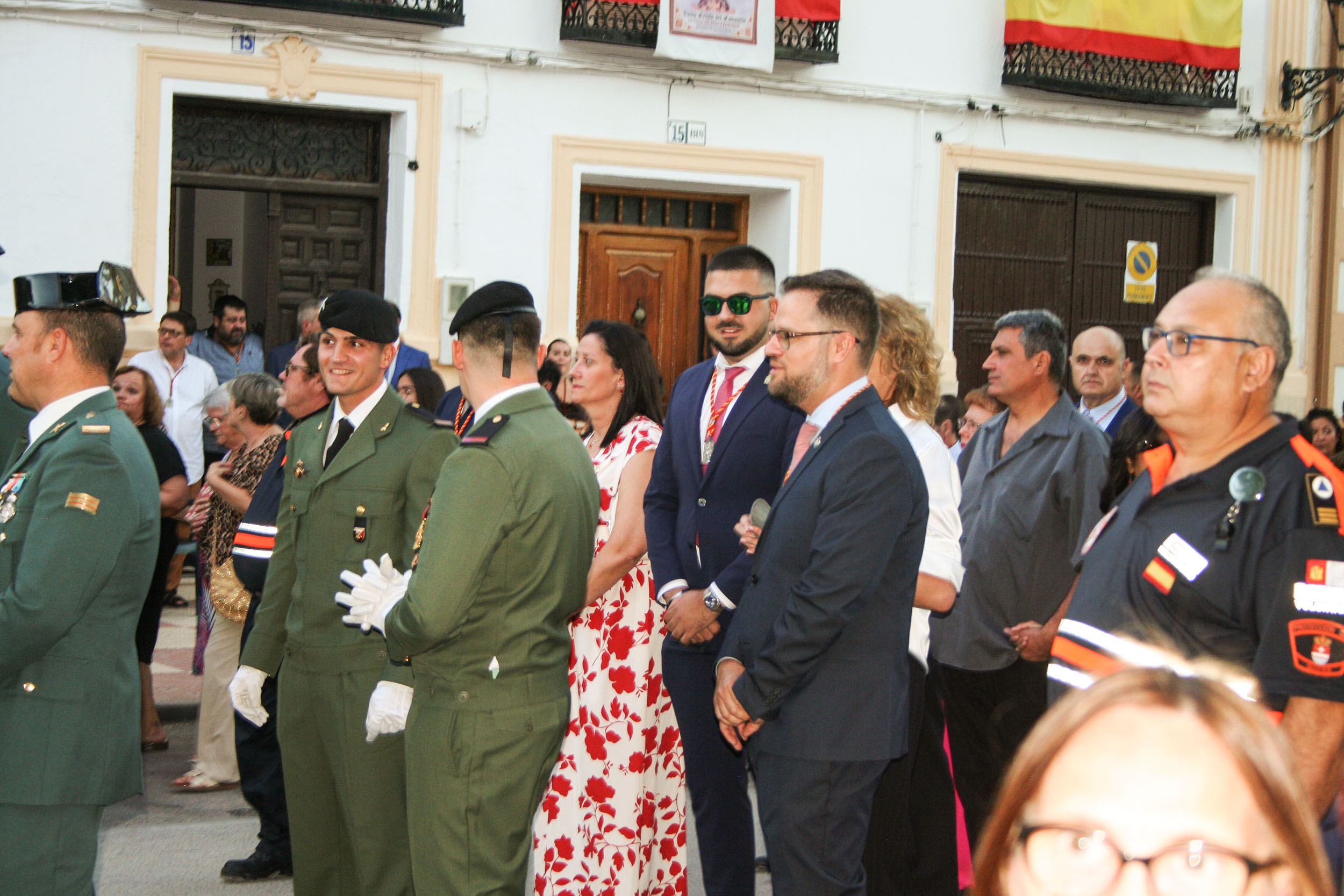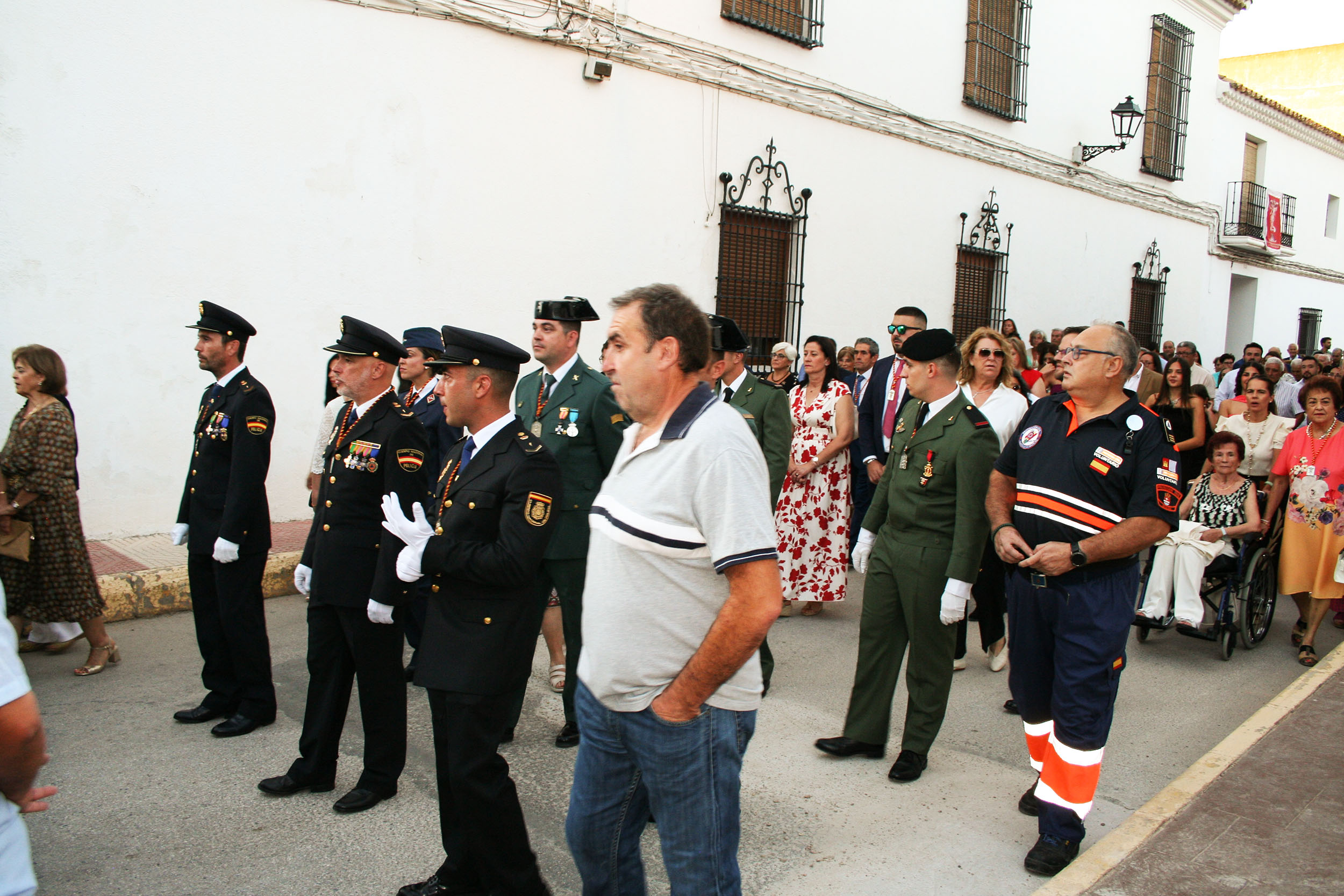La comitiva civil la presidió el alcalde, Jaime Santos Simón, que estuvo acompañado de la corporación municipal, la pregonera Inmaculada Díaz-Maroto Cicuéndez, la jueza de Paz, los alcaldes de Lillo (Julián Sánchez Casas), de La Puebla de Almoradiel (Alberto Tostado), de Quintanar de la Orden (Pablo Nieto), de Cabezamesada (Mª Ángeles Herrero), de El Romeral (Francisca Polán), la diputada provincial de Villanueva de Alcardete y alcaldesa (Mª Dolores Verdúguez), el alcalde de Villanueva de Bogas, José Miguel Rodríguez Martín, el alcalde de Villamayor de Santiago, Jesús Fernández Fernández y la alcaldesa de La Guardia, Marta Maroto; junto a concejales de El Toboso y Quintanar de la Orden entre otros. A la comitiva se le sumó la Policía Municipal, miembros de la Guardia Civil, Policía Nacional y del Ejército en gran número, hijos de La Villa de don Fadrique. Y por todo el recorrido, miembros de Protección Civil de la población fadriqueña, pero también de municipios vecinos, que pusieron su grano de arena para que todo saliera perfecto.